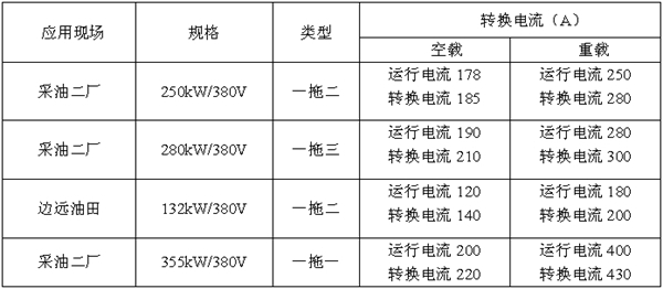 我們公司在青海油田應(yīng)用了幾套大功率一拖多的控制柜,從調(diào)試的情況看,轉(zhuǎn)換效果都比較理想?,F(xiàn)將轉(zhuǎn)換試驗的效果列出表格,如下: