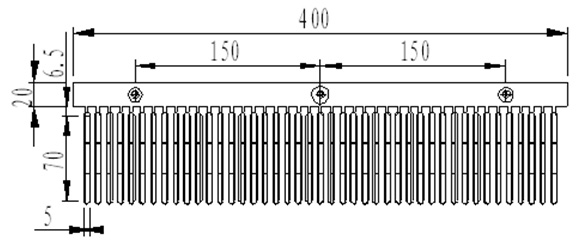 按照器件均勻布置的原則,所需散熱片寬度約為300~400mm,選400mm;長(zhǎng)度約為450~600mm.選480mm。