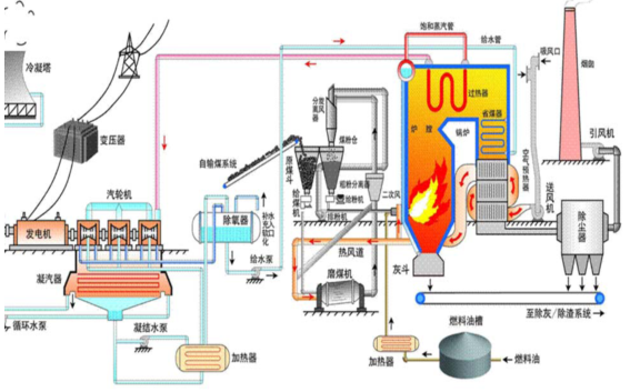 電廠主要組成:風(fēng)系統(tǒng)、燃料輸送系統(tǒng)、給水蒸汽系統(tǒng)、冷卻系統(tǒng)。鍋爐是一個(gè)換熱器,主要由爐膛、水冷壁、過熱器、省煤器、空氣預(yù)熱器組成。