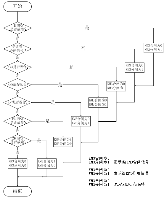 開機(jī)刀閘條件2滿足的條件為:K1閉合,K2閉合,KM5或KM6有且只有一個(gè)吸合,有高壓就緒。