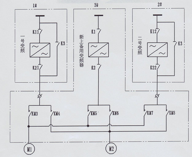 1#和2#是原來兩套變頻器系統(tǒng),3#是新上備用變頻器。正常情況下KM3,KM8吸合,1#和2#變頻器分別驅(qū)動(dòng)兩臺(tái)電機(jī)。假如1#變頻器出現(xiàn)故障,KM3交流接觸器斷開,KM5吸合。3#變頻器以飛車啟動(dòng)模式把電機(jī)帶起來,不影響生產(chǎn)。假如2#變頻器出現(xiàn)故障,KM8交流接觸器斷開,KM6吸合,3#變頻器以飛車啟動(dòng)模式把電機(jī)帶起來。把故障變頻器維修好后,給3#備用變頻器切換信號(hào),3#變頻器輸出交流接觸器KM5或KM6斷開,原來對(duì)應(yīng)的接觸器吸合,維修后的變頻器以飛車形式啟動(dòng)。同樣,如果開始投入的是2#和3#變頻器,其中的一臺(tái)出現(xiàn)故障,也可以切換到1#變頻器上。實(shí)現(xiàn)了1#,2#、3#三臺(tái)變頻器之間的任意切換。
