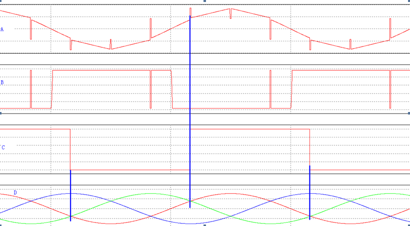 在這個(gè)電路中通過(guò)光耦TA、TB、TC的次級(jí)就可以獲取三相的過(guò)零信號(hào),但在反向整流工作中仍然由于電源缺口在光耦次級(jí)會(huì)有比較窄的過(guò)零脈沖,但是完全可以通過(guò)CPLD適當(dāng)?shù)奶幚砣サ?,如圖3中的藍(lán)色,沒(méi)有經(jīng)過(guò)CPLD處理時(shí)獲取的信號(hào):