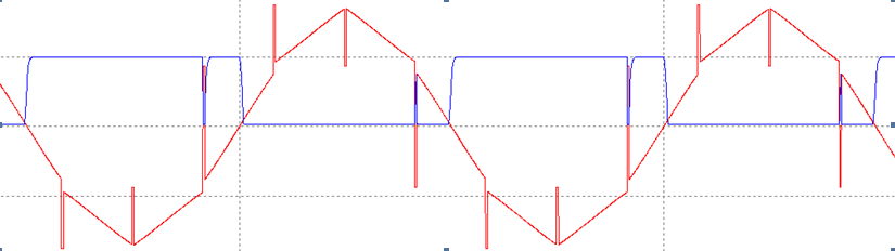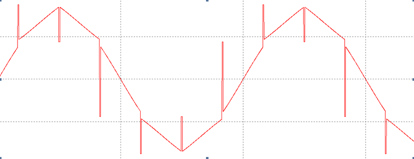 在模擬電路產(chǎn)生信號(hào)中,主要還是對(duì)線電壓或者相電壓過(guò)零點(diǎn)的獲取,在過(guò)零點(diǎn)的獲取中常用的是用運(yùn)放進(jìn)行過(guò)零比較。在反向整流工作中,由于電源的內(nèi)阻存在,在輸入電源上就存在IGBT開(kāi)通或關(guān)斷時(shí)產(chǎn)生的缺口,如圖1所示: