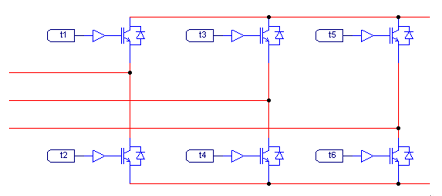 圖中t1\t2對(duì)應(yīng)A相,t3\t4對(duì)應(yīng)B相,t5\t6對(duì)應(yīng)C相,假設(shè)信號(hào)a\b\c進(jìn)行濾波延時(shí)處理后的信號(hào)為A\B\C,則6個(gè)驅(qū)動(dòng)信號(hào)的邏輯處理為: