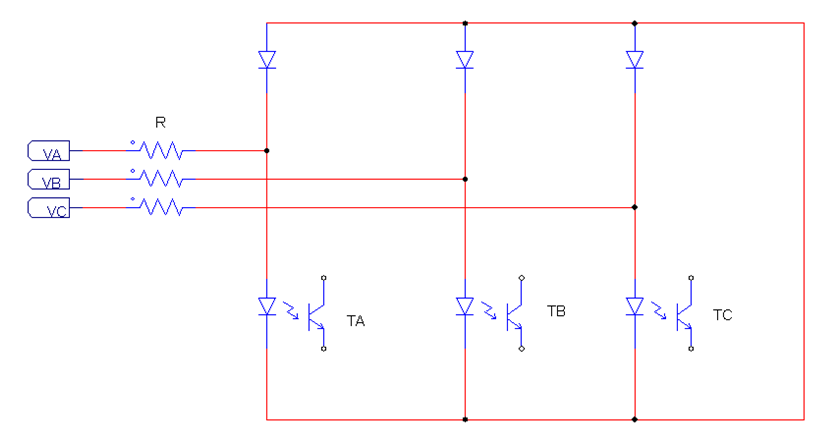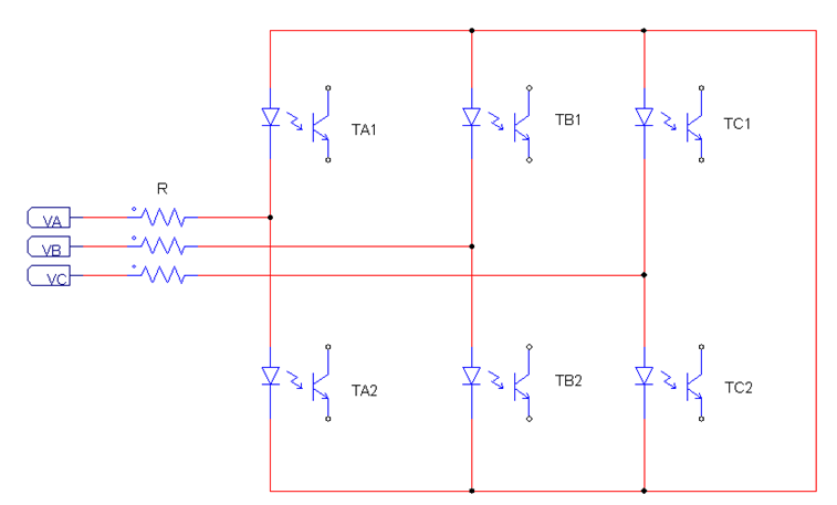 由于反向整流要求同步信號(hào)有比較高的對(duì)稱波形,上面的電路中只是取到了相電壓的大于零的部分,但由于光耦和二極管的壓降存在,可能會(huì)使得不對(duì)稱的情況產(chǎn)生,所以如果要正負(fù)半周對(duì)稱,可以考慮使用6個(gè)光耦來(lái)產(chǎn)生信號(hào),如下圖: