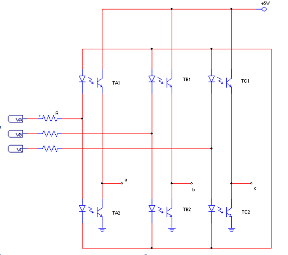 對(duì)于上述情況考慮采用光耦來(lái)獲取同步信號(hào)的過(guò)零點(diǎn),這樣就可以不用考慮三相中點(diǎn)電位問(wèn)題,又能夠獲取相電壓的過(guò)零點(diǎn),初步方式如圖2所示: