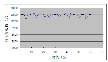 FGSVG運(yùn)行后無功功率補(bǔ)償效果非常理想,系統(tǒng)側(cè)平均功率因數(shù)穩(wěn)定在0.95以上,系統(tǒng)側(cè)的無功功率降低到300kvar以下。FGSVG投運(yùn)后對(duì)沖擊性無功功率快速補(bǔ)償,有效的抑制了電網(wǎng)電壓的閃變,電網(wǎng)電壓最大波動(dòng)200V,基本穩(wěn)定在10500V附近,保證了用電設(shè)備的安全運(yùn)行,如圖4所示。