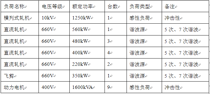 現(xiàn)場主要負(fù)荷是1臺(tái)1250kW/10kV橫列式軋鋼機(jī)和數(shù)臺(tái)不同功率等級(jí)的低壓直流軋機(jī),以及生產(chǎn)線上運(yùn)動(dòng)部件的低壓交流驅(qū)動(dòng)電機(jī)。